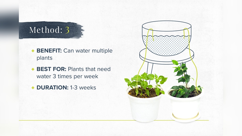 The water-wick method uses a piece of cotton or nylon string. One end goes into a water container, the other into the soil near the plant roots. Water travels through the wick by capillary action, keeping soil moist. This setup is cheap and easy to make. It works best for small to medium-sized pots.